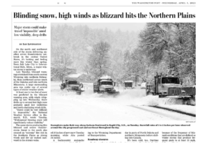 More specifically, Ian Livingston reported in today’s Washington Post that, “On the north and northwest side of the storm delivering another severe thunderstorm outbreak in the central United States, it’s looking and feeling more like winter than spring. From Salt Lake City to International Falls, Minn., a major winter storm is underway.