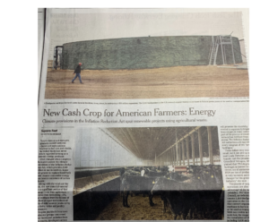 “Along with the wind and the sun, the raw materials needed for a significant portion of that energy come from agriculture — alcohol from fermenting corn, and methane from the billions of gallons of liquid and millions of tons of solid manure produced by big dairy, swine and poultry operations.